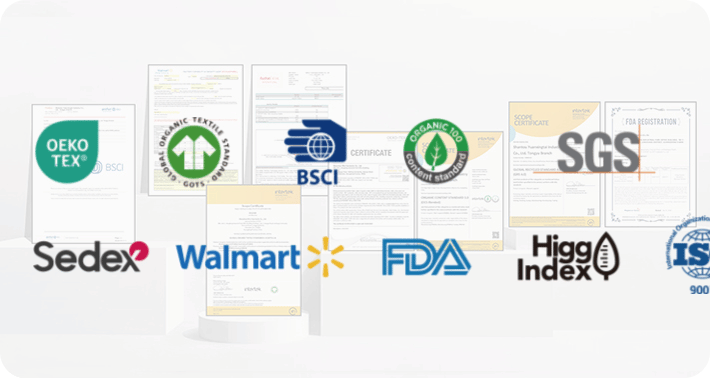 Lynmiss is fully certified with OEKO-TEX®, OCS, GRS, BSCI, SEDEX, and FDA-related quality systems, ensuring every product meets strict international safety and sustainability standards. Our certifications reflect our commitment to responsible manufacturing and give global brands complete confidence in quality, compliance, and long-term reliability.