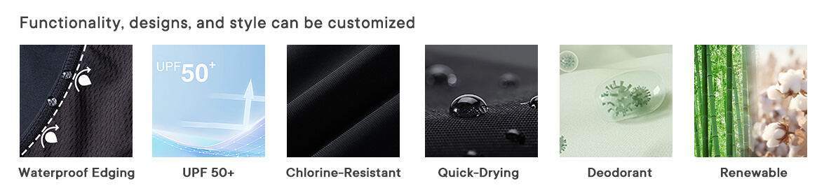 The outer swim fabric supports UV protection options (custom UPF levels available upon request), suitable for outdoor swimming and beachwear applications.