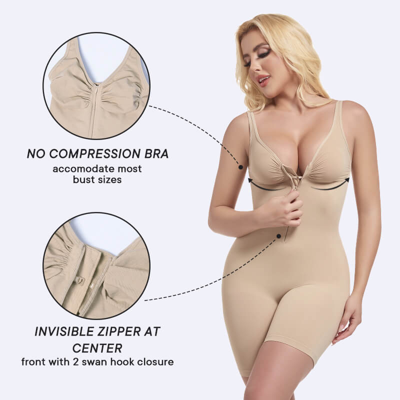 This style extends to mid thigh for full leg coverage and includes strong compression at the thighs—ideal for dresses and skirts. The zip brief bodysuit (LSK22) offers brief coverage with full rear coverage and snap gusset. Both feature invisible front zippers and supportive bust stitching.